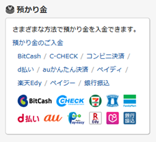 預かり金の種類には、BitCash、楽天Edy、C-CHECK、コンビニ決済、d払い、auかんたん決済、あと払いペイディ、ペイジー、銀行振り込みがあります。